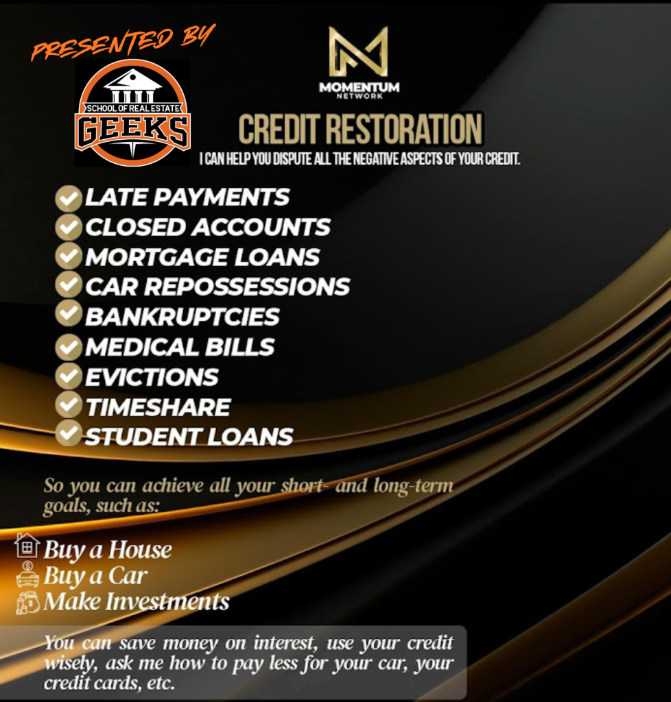 The School of Real Estate Geeks is proud to announce our new partnership with Momentum AI Credit Repair, a cutting-edge credit restoration service that leverages the power of artificial intelligence to dispute and remove negative items from your credit report.